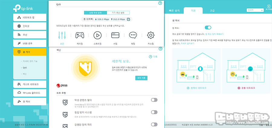그 외 인터넷 사용의 우선순위를 분배하는 QOS와 Trend Micro 기반의 악성 소프트웨어 방지 기능과 메쉬 와이파이 기능 등을 간편하게 설정할 수 있습니다.