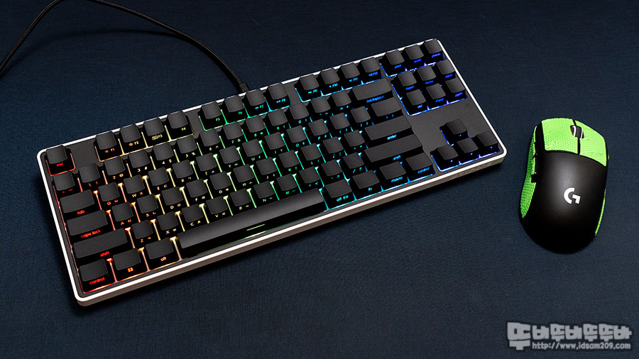 하우징 : 크림 화이트 / 스위치 : 체리 MX RGB 갈축 / 키캡 : ABS / 각인 : 한글 각인이 적용된 모델입니다.