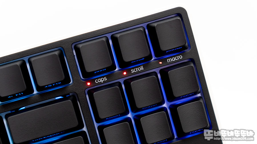레드 컬러로 표현되는 LED 인디케이터는 Caps Lock, Scroll Lock 키 사용 시 점등으로 표현, 매크로 입력 시 점멸, 매크로 고정 기능 사용 시 점등으로 표현되어 제품의 상태를 빠르게 파악할 수 있지만 정자세로 타이핑 시 키캡에 가려 LED 인디케이터가 눈에 잘 띄지 않는 부분은 감수하시고 사용해야 할 거 같네요.