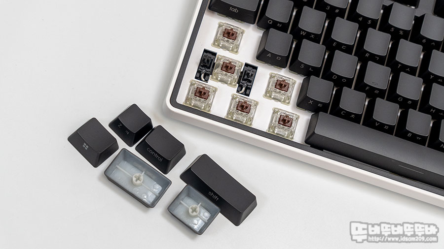 기본적으로 흡음제를 사용한 제품답게 잡 소음이 없는 편이며 특히 보강판이 아닌 기판용 스테빌라이저와 기본 윤활 처리로 정갈한 스테빌라이저 소음을 들려주기에 대부분의 기성품에서 접할 수 있는 소음을 느낄 수 없고요.