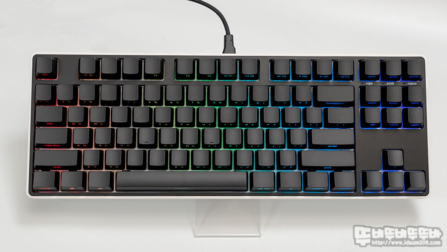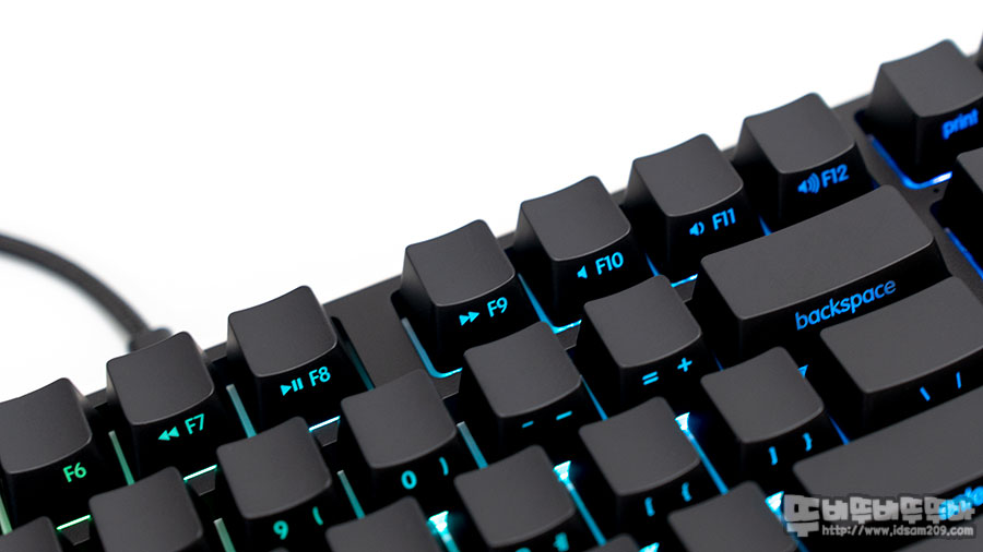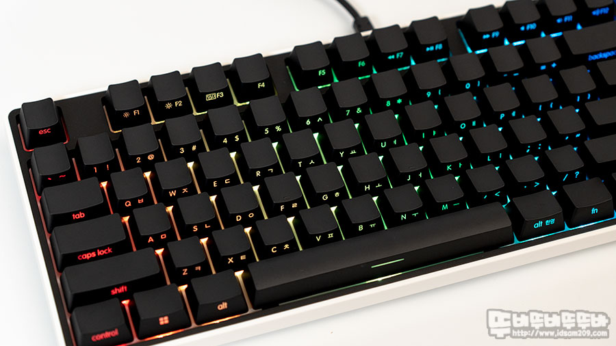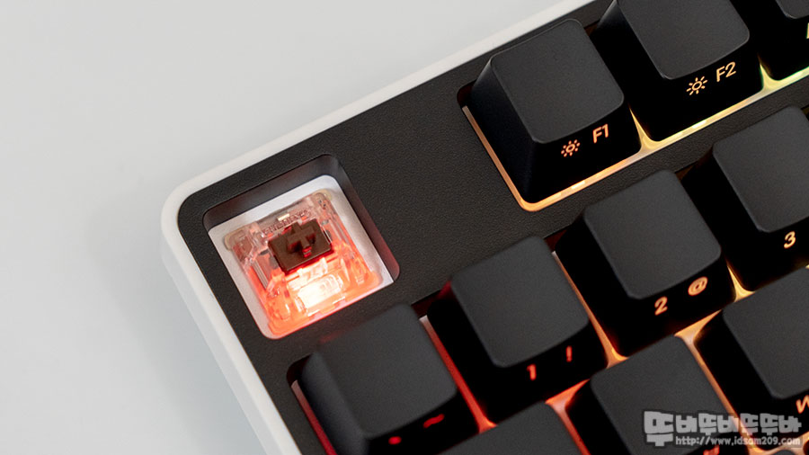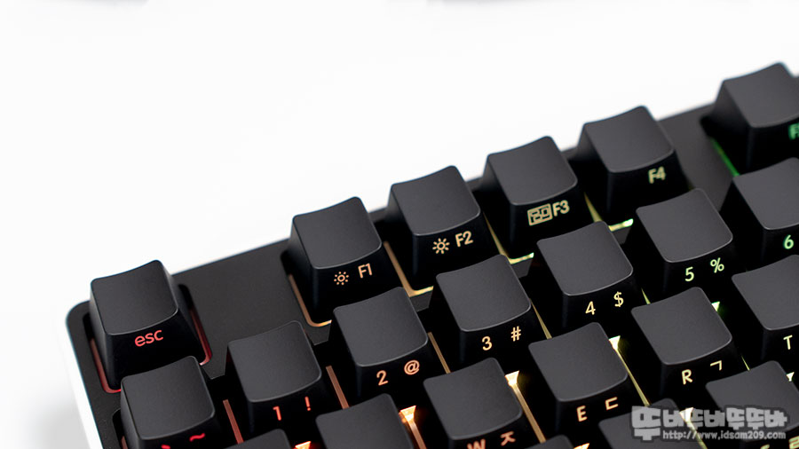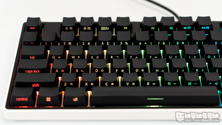 보강판 밑에 위치한 기판에 장착된 RGB LED 소자로부터 빛이 시작되어 정방향으로 장착된 체리 MX RGB스위치 투명 커버를 통해 발산되기에 LED 광량 손실이 많은 편이지만 정방향 스위치 덕에 LED 광량이 형광등 아래에서도 잘 표현되고 있습니다.