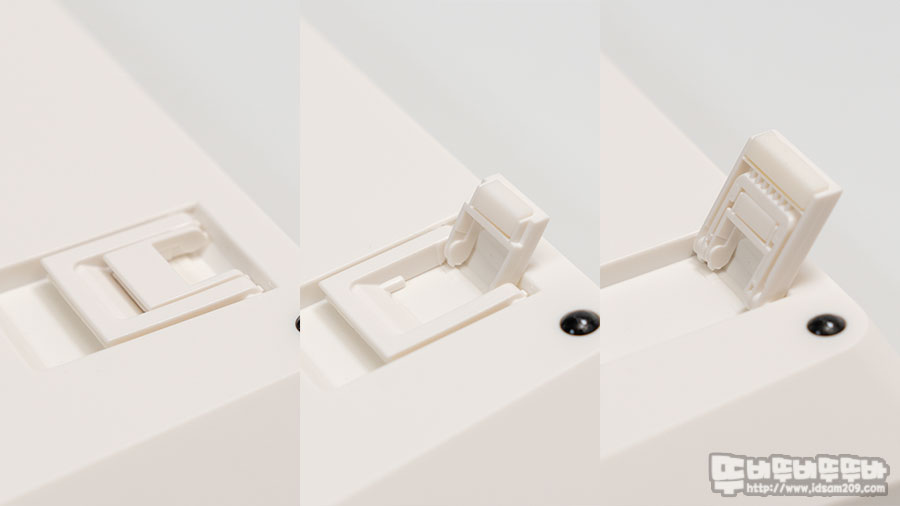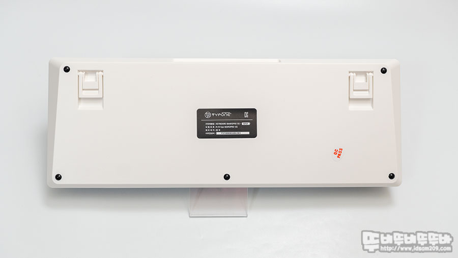 키보드 하판에는 미끄럼을 방지하는 패드와 2단계 높이 조절이 가능한 높이 조절 다리가 사용되어 다양한 타이핑 각도를 만들어주는 필자가 사용하기엔 자체 경사 하우징에 1단 높이 조절을 적용하니 가장 만족도가 좋았습니다.