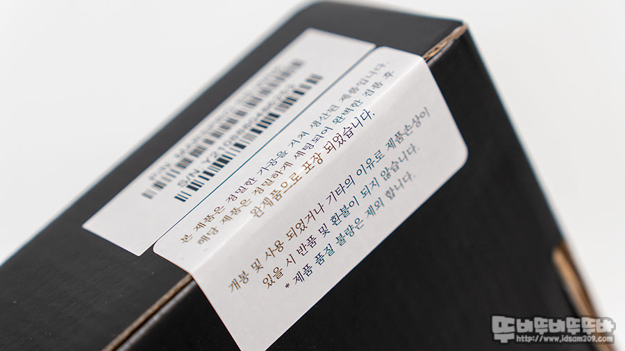 제품에 대한 특별한 내용은 번잡스럽게 표현되어 있지 않으며 패키지 개봉하는 경계면에 개봉 시 단순 변심 반품은 불가하다는 안내가 인쇄된 봉인 씰이 부착되어 있습니다.