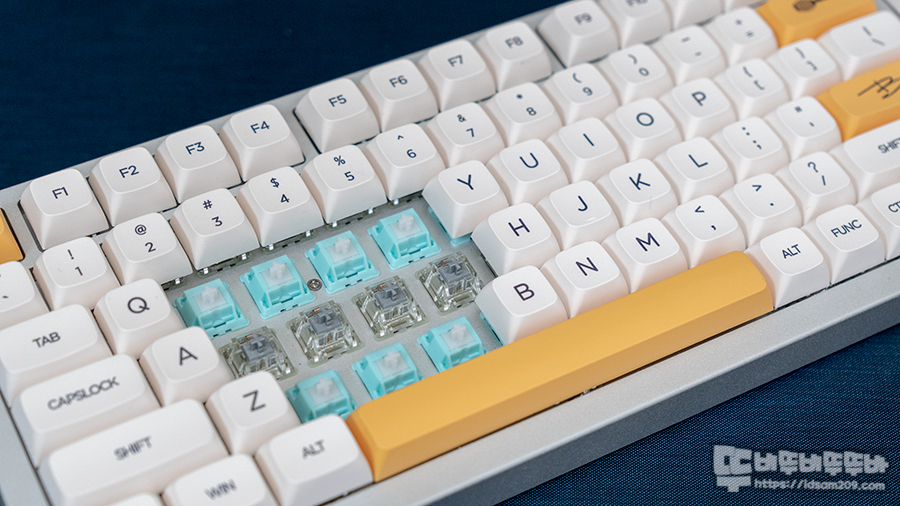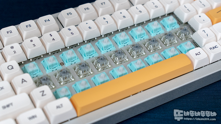 키압이 60g으로 표기되어 있지만 실제 느낌은 체리 MX 적축 느낌으로 Unlubed(비 윤활) Lynx(링스) 스위치 스템의 사각이는 느낌과 스위치를 눌렀을 때 가벼운 소음을 들려주지만, Lubed(윤활) Lynx(링스) 스위치는 윤활의 영향으로 정숙한 느낌을 주네요.