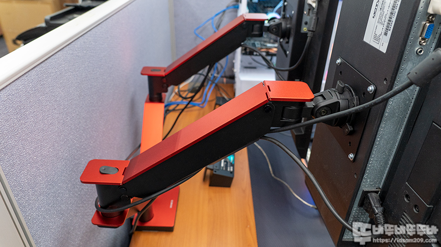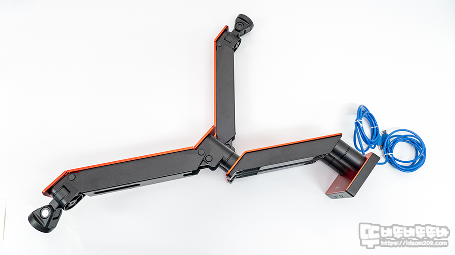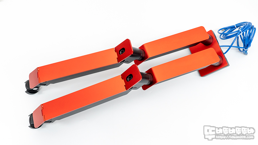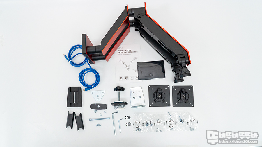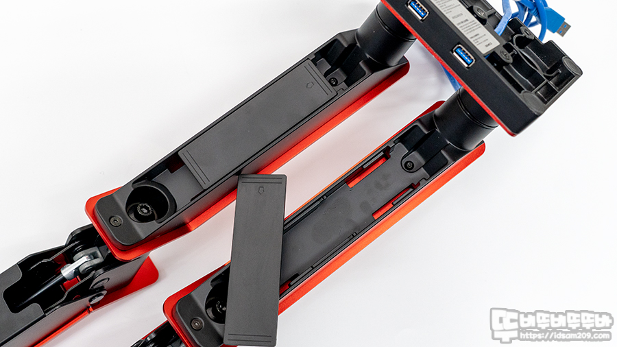 제품 측면에 확인 가능한 제품 컬러 확인이 가능한데 필자가 리뷰하는 제품은 RED 컬러 듀얼 모니터 암입니다.