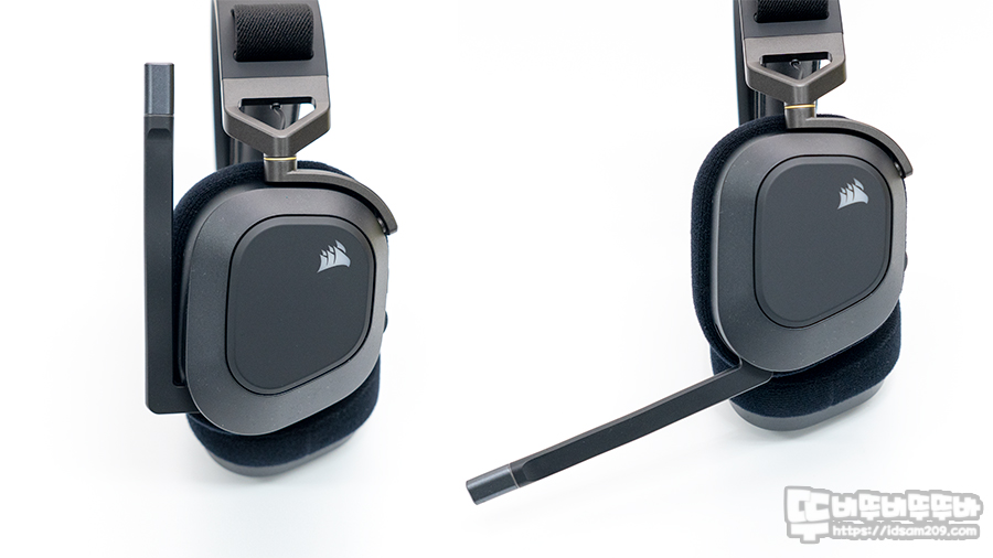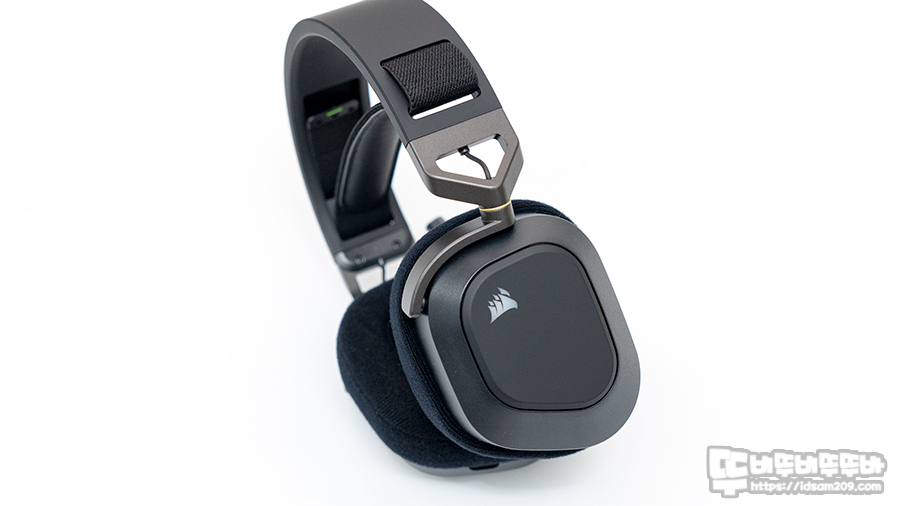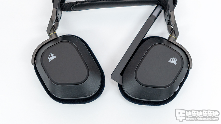 커세어 HS80 RGB WIRELESS 게이밍 헤드셋 대칭형 디자인의 측면 모습.