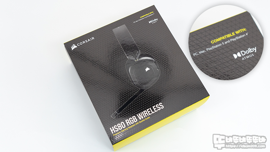 제품의 패키지에는 제품의 이미지와 모델명 HS80 RGB Wireless 그리고 돌비 애트모스 지원을 확인할 수 있으며 무선 리시버를 사용하는 방식이기에 USB 포트를 지원하는 PC, PS4, PS5, MAC 등 다양한 기기에서 사용이 가능합니다.