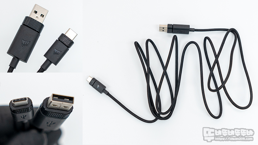 2.4GHz 무선 리시버와 USB-C to A 충전 겸 유선 케이블 모습.