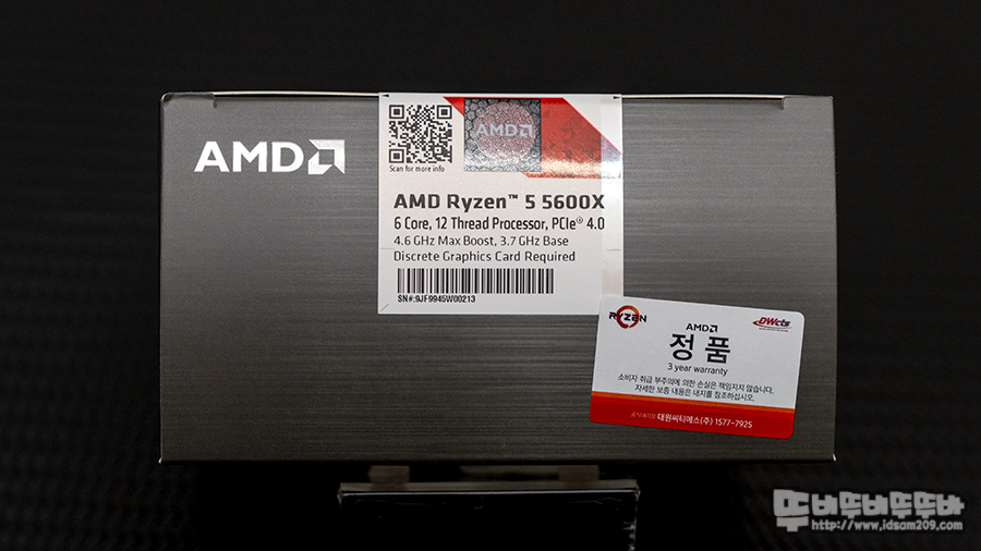 정품 패키지의 측면에는 CPU의 히트 스프레더 표면에 인쇄된 라이젠과 5600X 내용과 패키지 상단에 라벨을 통해 모델명에 대한 정보를 확인할 수 있습니다.