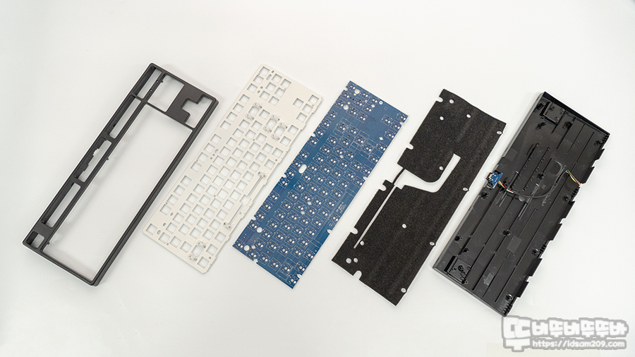 일반적인 키보드들은 보강판과 기판 사이가 비어있는 상태로 출시하는데 이 경우 키보드 내부의 울림이 있게 되어 스위치와 하우징 내부의 울림 등이 복합적으로 발생하게 됩니다.