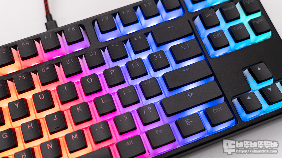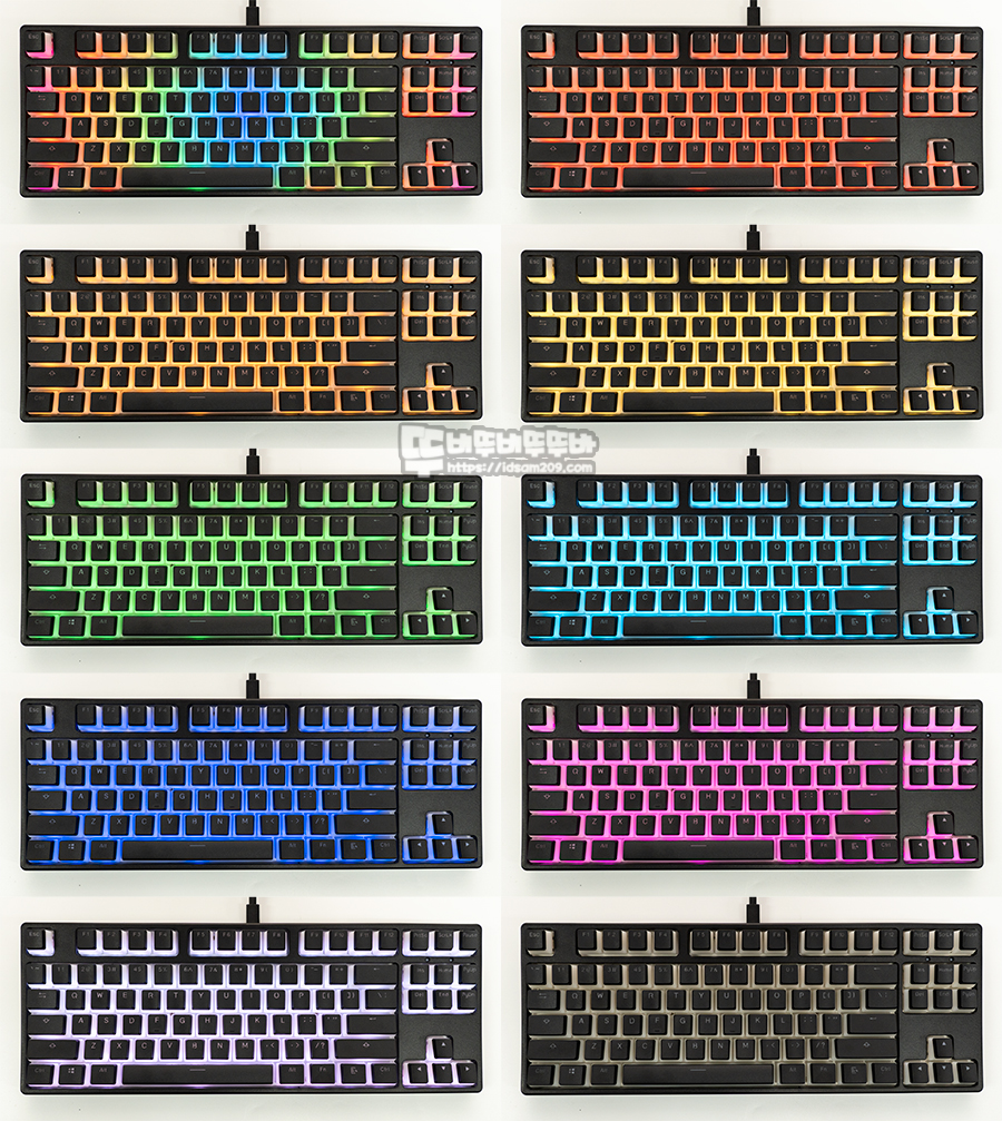 US 표준 87키 배열 / 스위치 교체가 가능한 핫스왑 지원 / 보강판용 체리 스태빌라이저 / N-Key 지원 / RGB LED 효과 / LED 매크로 지원 등을 확인할 수 있네요.