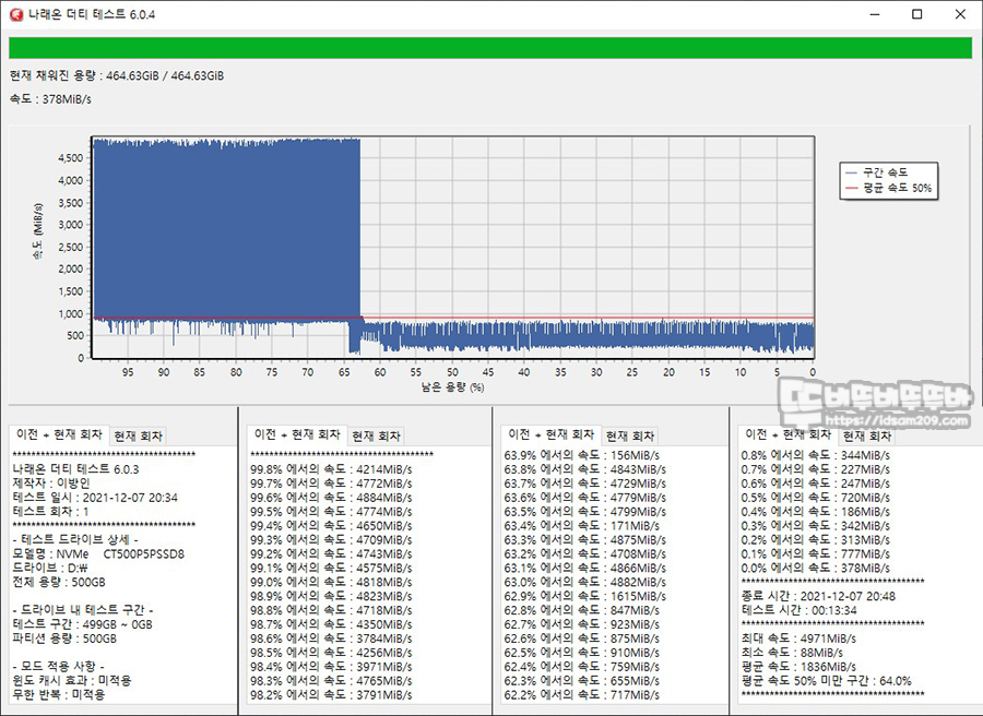나래온 더티 테스트에서는 캐시 적용 구간 쓰기 속도가 최대 4,971MB/s, 평균 속도는 1,836MB/s을 보여주며 이후 구간에서는 1,000MB/s 이하 속도를 보여주고 있습니다.