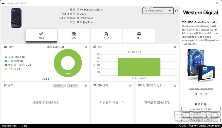전체적인 디스크 상태, 성능, 도구 그리고 설정 메뉴를 통해 포맷 및 TRIM, 펌웨어 등의 관리가 가능한 WD의 대시보드 프로그램을 통하여 WD NEW My Passport SSD 관리도 가능하니 참고하시면 좋을 거 같습니다.
