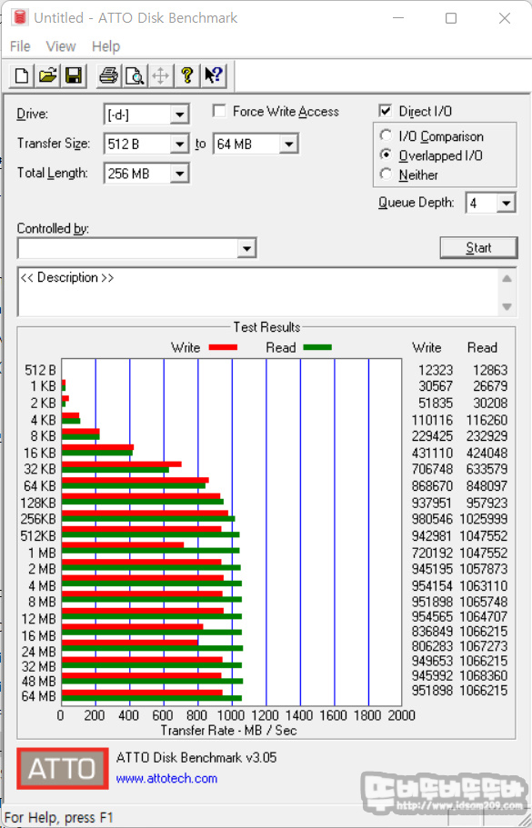 CrytalDiskMark 테스트에서는 제품 스펙 정보로 표시하고 있는 최대 읽기 속도 1,050MB/s의 최대 쓰기 속도 1,000MB/s에 준하는 읽기 속도 1,065MB/s, 쓰기 속도 970MB/s를 보여주고 있으며 그 외에 테스트에서도 준수한 성능을 보여주고 있습니다.