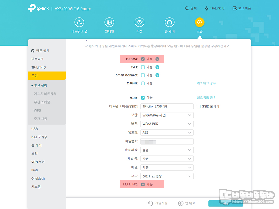 여러 대의 무선 기기 연결을 위한 OFDMA와 MU-MIMO 기능은 수동으로 설정을 해줘야 하며 과거의 무선 표준 제품과 동시 사용 시에도 각 장비들의 최대 속도를 지원하는 Airtime Fairness 기능 또한 수동으로 활성화를 해주어야 하니 꼭 참고하여 주시기 바랍니다.