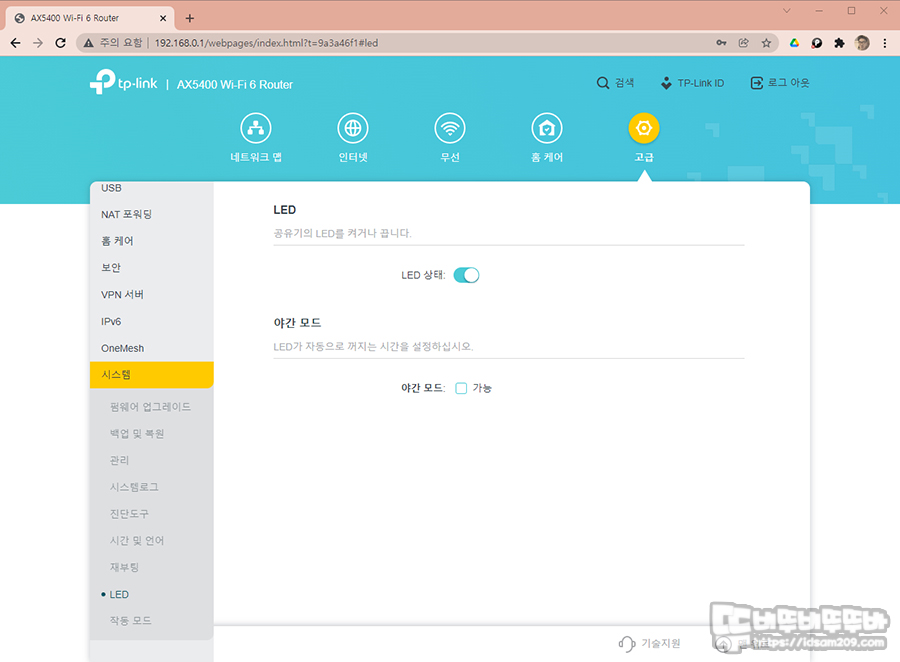 시스템 메뉴에서는 LED On/Off 및 시간대별 자동 On/Off 기능을 지원하지만 제품 뒷면에 버튼 조작이 더 빠를 수 있으니 편한 방법을 사용하세요.