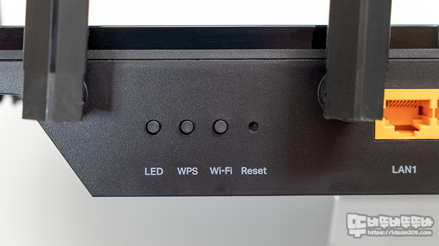 가장 왼쪽부터 전면 LED On/Off, WPS, Wi-Fi On/Off, 리셋 스위치를 확인할 수 있는데 전면 LED On/Off 기능은 관리자 메뉴에서도 제어가 가능하지만 버튼 빠르게 조작할 수 있어 LED로 인한 수면방해를 해소할 수 있어서 좋았습니다.
