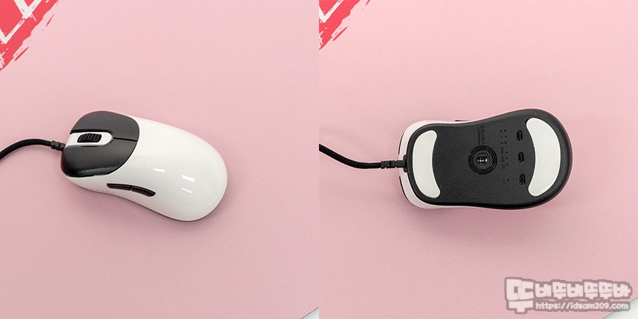 테스트에 사용된 마우스는 첫 번째로 VAXEE OUTSET AX 모델로 무게는 약 77g에 마우스 바닥면에 앞쪽과 뒤쪽에 넓지는 않지만 적당한 사이즈의 피트가 부착되어 있습니다.
