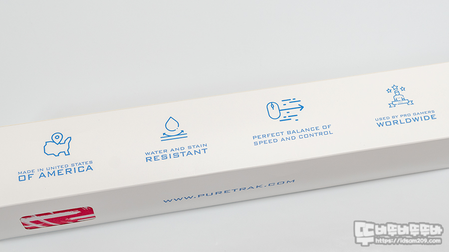 영문으로 미국 생산, 물과 얼룩 방지, 스피드와 컨트롤의 완벽한 균형, 전 세계 프로게이머가 사용 등의 특징을 강조하고 있습니다.