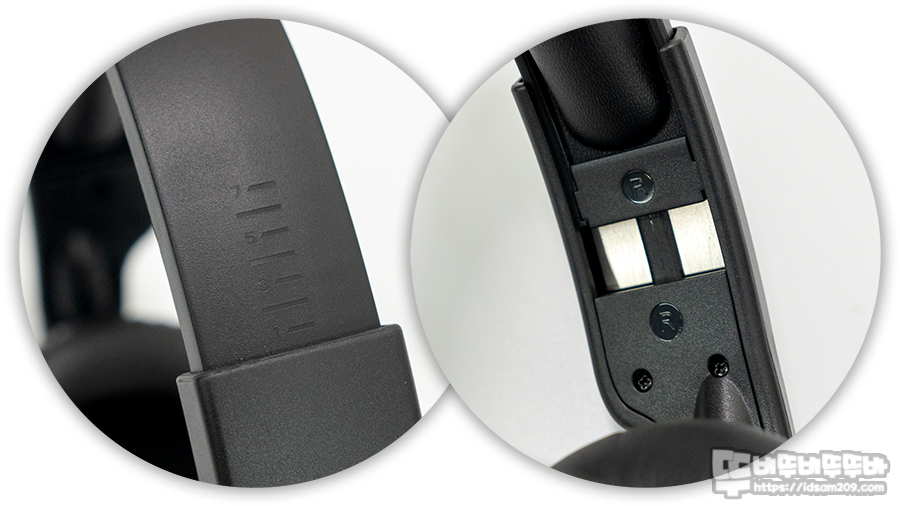 머리 위를 감싸는 플라스틱 헤어밴드와 다르게 길이 조절을 하는 측면 밴드는 내부에 금속을 사용하여 측면 밴드의 형태를 유지하여 헤어밴드의 형태를 지지하는 느낌을 주는데요.