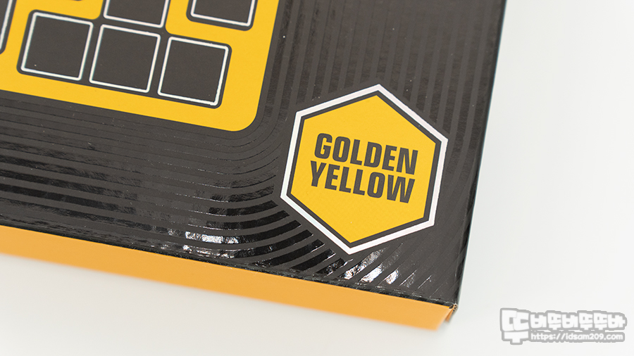 패키지에는 GMMK PRO TOP FRAMES 전기영동 코팅이 적용되었다는 카피와 제품의 컬러 Golden Yellow에 대한 정보를 부각하고 있습니다.