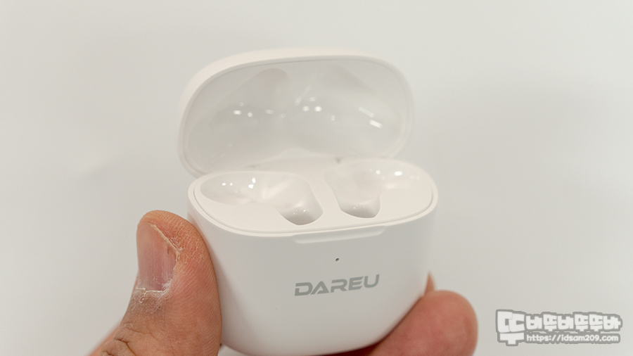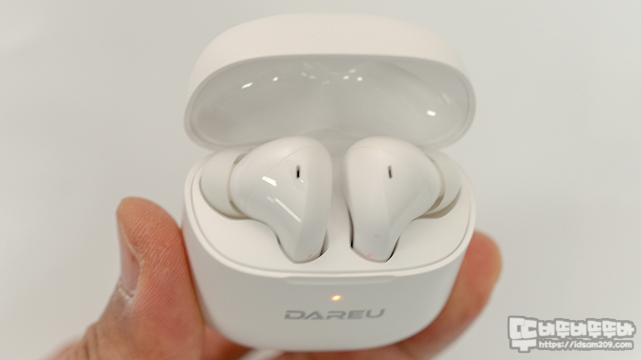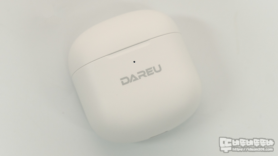 무광 UV 코팅처리가 된 다얼유 D5 블루투스 이어폰 충전 케이스는 전면에 DAREU 로고와 배터리 상태를 보여주는 LED 인디케이터, 바닥면에 USB-C 충전 단자를 확인할 수 있고요.