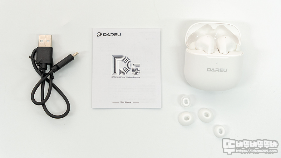 제품은 다얼유 D5 충전 케이스 + 무선 이어버드, USB-C to A 충전 케이블, 여분의 실리콘 이어팁, 사용 설명서로 구성되어 있습니다.