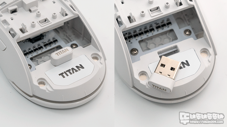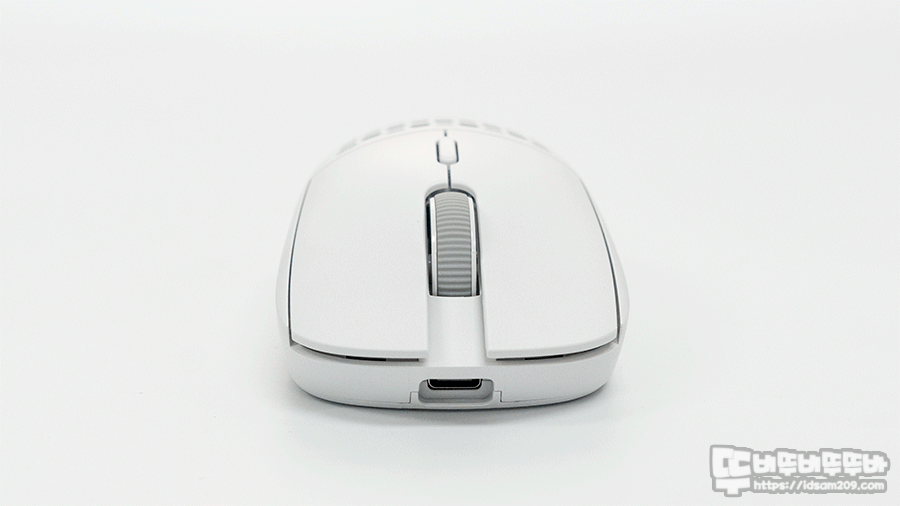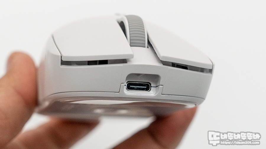 마우스 전면의 충전 단자는 USB-C 포트가 내장되어 있으며 커넥터의 안정적인 결합과 사용을 위해 전용 케이블의 몰딩이 딱 맞게 사용할 수 있는 홈이 적용되었고 리튬폴리머 배터리가 하우징 중앙 부분 위쪽에 위치하고 있어 마우스 무빙 시 좋은 균형감을 주고 있습니다.