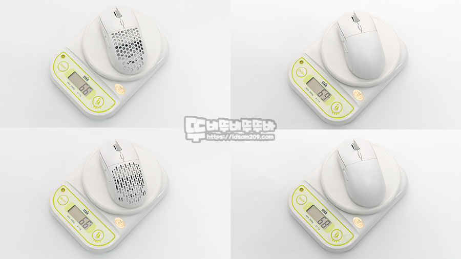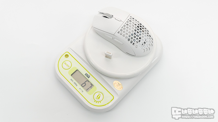 1g 단위로 측정 가능한 디지털 저울로 무게 측정 시 무선 리시버를 포함한 마우스 무게는 약 67g이며 무선 리시버 제외한 무게에서 타공 커버는 모두 66g, 솔리드 커버 사용 시 68g 또는 69g 무게로 팜커버를 이용하여 무게감에 변화를 줄 수 있으니 참고하시기 바랍니다.