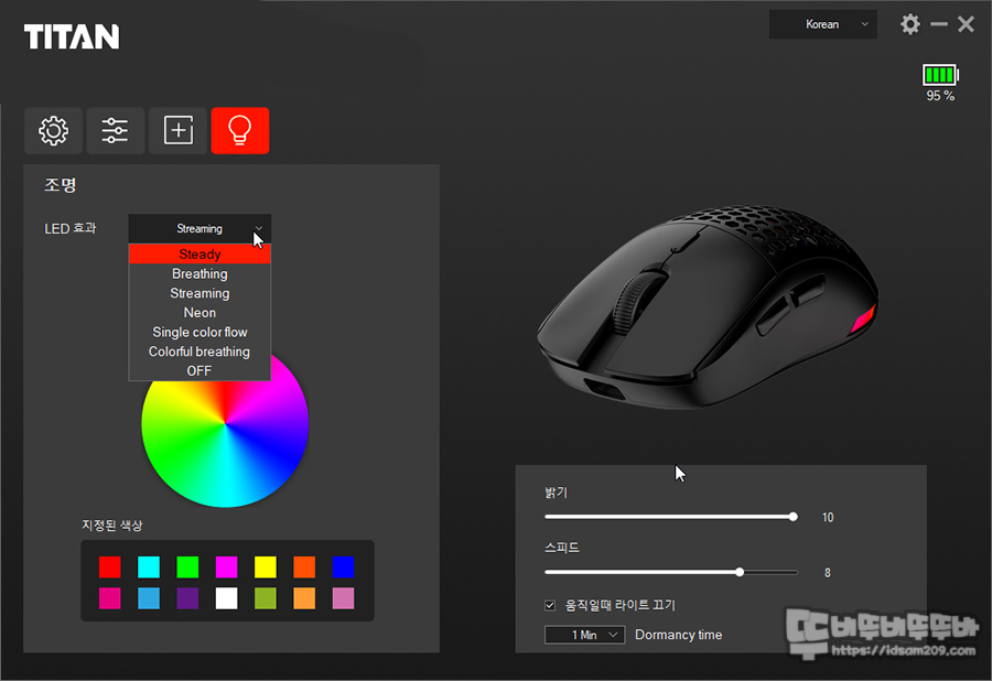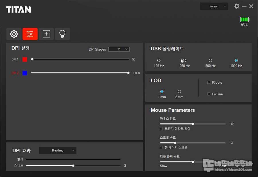 그 외 윈도우즈 제어판에서 볼 수 있는 마우스 파라미터 설정 부분과 DPI LED 효과에 대한 설정도 가능하며 모든 LED 효과 부분은 배터리 사용 시간과 직결되는 부분이니 적절하게 설정하시는 걸 추천드립니다.