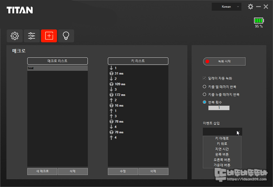 매크로 기능은 매크로 파일명 생성 이후 녹화 시작 버튼을 눌러 키 입력을 저장하는 과정을 거치는데 보통의 게이밍 마우스의 매크로 기능과 동일하여 어려움 없이 사용이 가능합니다.