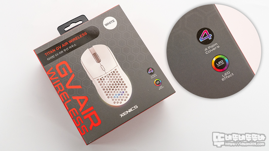 제닉스 GV Air Wireless 게이밍 마우스의 패키지에는 제품의 이미지와 4가지 팜커버 제공 및 LED 효과를 강조하고 있습니다.