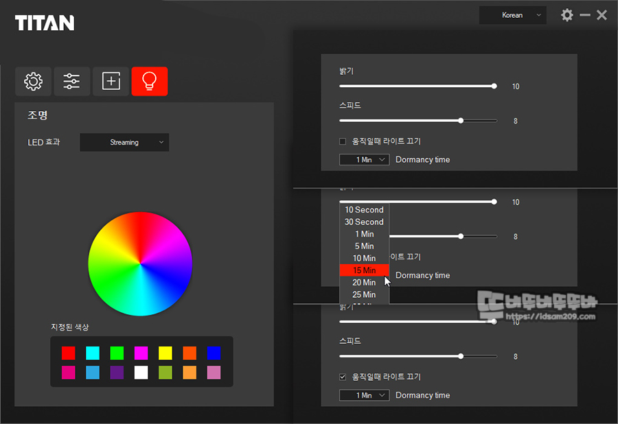 메뉴 하단부에 "움직일떄 라이트 끄기" 옵션으로 지속적인 LED 라이팅 선택 유무와 LED 라이팅이 꺼지는 시간을 다양하게 설정할 수 있지만 무선 마우스의 사용 시간을 감안하여 적절하게 선택하시는 게 좋을 거 같습니다