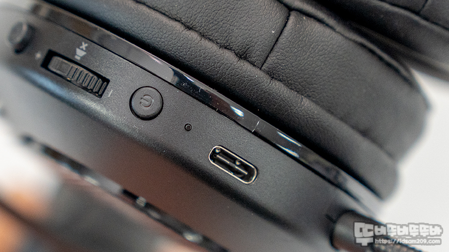 왼쪽 이어컵 하우징 부분에 위치한 컨트롤부를 살펴보면 마이크 On/Off 버튼, 조그 방식의 볼륨 버튼, 전원 버튼과 전원 LED 인디케이터, USB-C 충전 포트로 구성되어 있으며, 조그 방식의 볼륨 버튼의 경우 위/아래 틸트 방식 그리고 누르는 방식으로 볼륨 및 음소거 조절을 간편하게 사용할 수 있습니다.