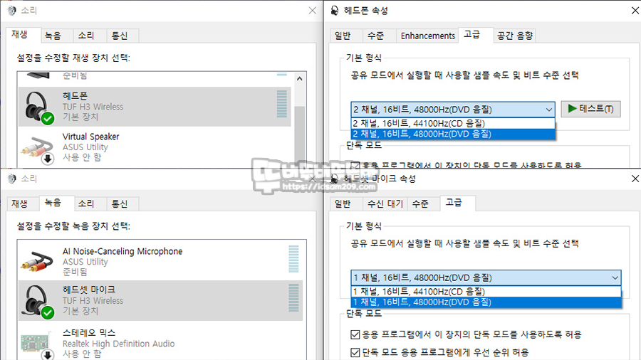 제어판 - 소리 설정에서 TUF H3 Wireless 장치로 연결된 것을 확인할 수 있으며 마이크와 스피커 모두 16비트, 48kHz 음질을 지원합니다.