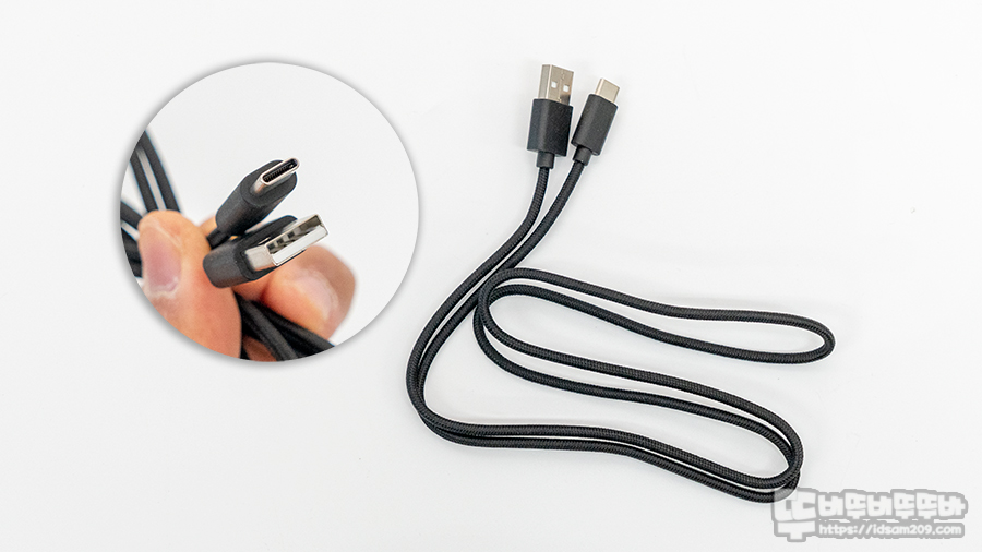 유연하지 않은 USB-C to A 충전 케이블 모습.