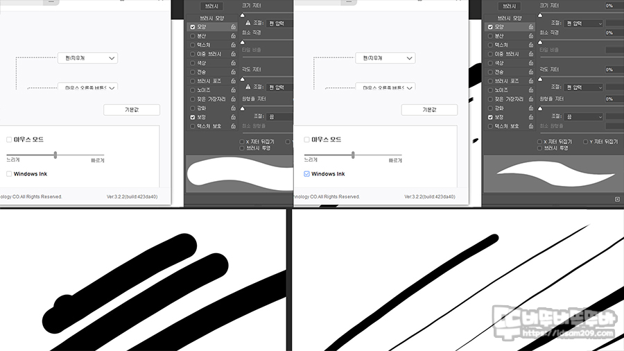 특히 포토샵에서 필압 설정이 안 되는 경우 전용 소프트웨어의 Window ink 옵션을 V표 체크를 하면 필압 적용이 가능하며 Window ink 옵션을 V표 체크가 안 되어 있는 경우 브러시 조절 부분에 △ 느낌표로 필압에 문제가 있음을 표시하니 참고하세요.