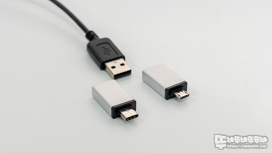 RF 2.4GHz 방식의 무선 리시버와 PC 본체에 연결 시 사용된 USB-A 단자에 연결하여 모바일 기기에 사용하게 되는 USB to USB-C 어댑터, USB to Micro USB 어댑터 모습인데요.