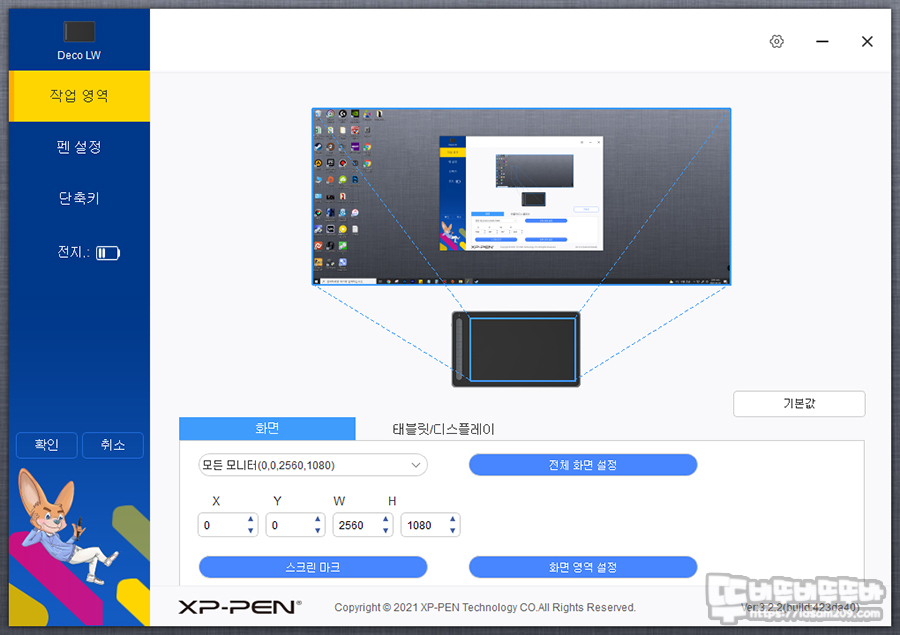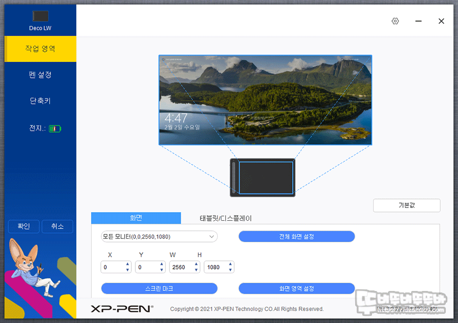 심플하면서도 직관적인 소프트웨어는 작업 영역 / 펜 설정 / 단축키 / 배터리 아이콘으로 구성되어 있는데요.