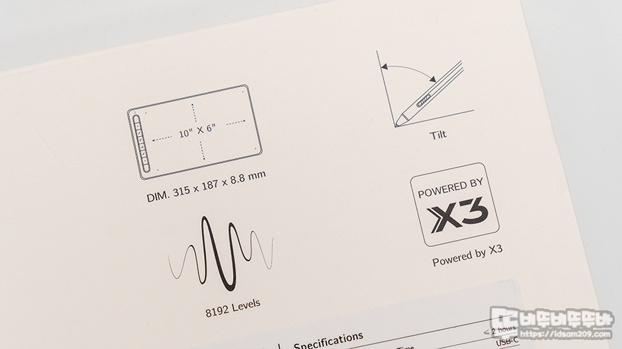 제품의 크기 315 X 187 X 8.8mm의 중형 사이즈, 펜의 작동 기울기를 설명하는 60도 틸트, 8192 필압 레벨, X3 스마트 칩 내장된 스타일러스에 대한 정보를 아이콘으로 표시 모습.