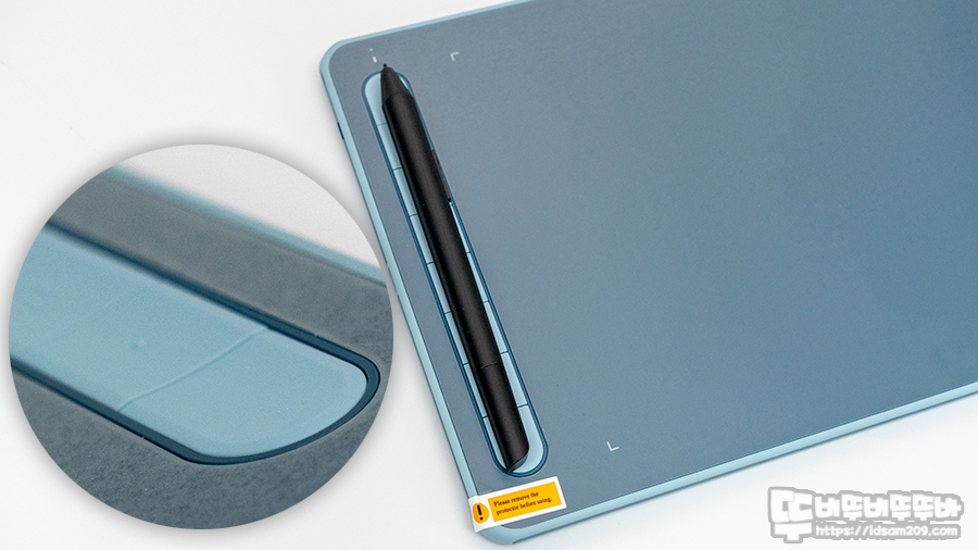 제품 뒷면에는 타블렛 사용 시 미끄럼을 방지하는 패드와 중앙 부분에 눌림을 방지하는 사출 모습을 확인할 수 있네요.