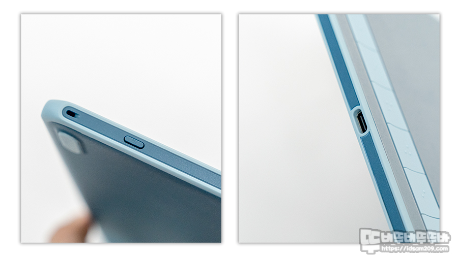 단축키 측면에 전원 버튼과 USB-C 단자 모습.