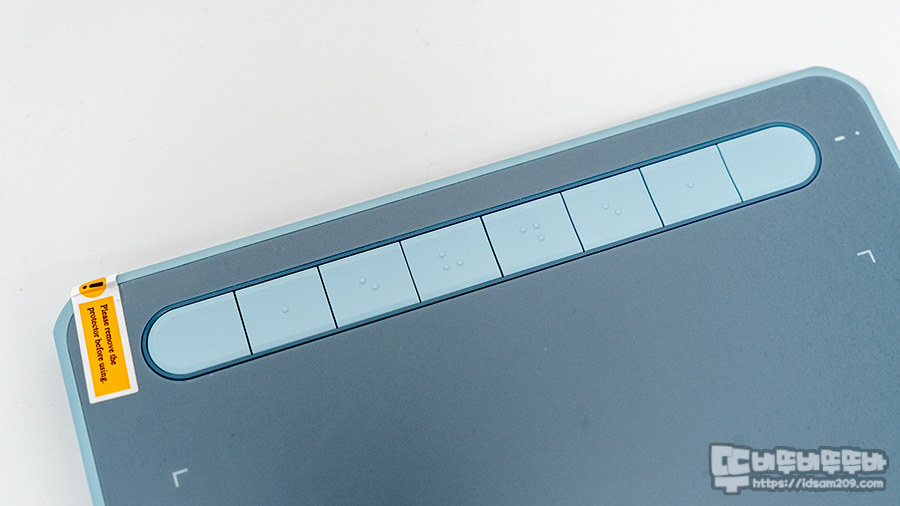 총 8개의 단축키는 타블렛 작업 시 편리하게 한쪽으로 배치되어 있으며 모서리 부분에는 실리콘 재질의 투톤 컬러 몰딩이 적용되어 제품을 보호하고 있습니다.