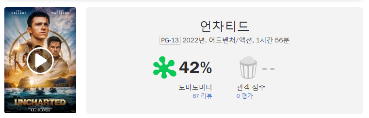 로튼 토마도 지수는 썩은 토마토로 표현되고 있는데 북미 쪽 개봉은 18일이라 그런지 관객 점수가 없는 편인데요.