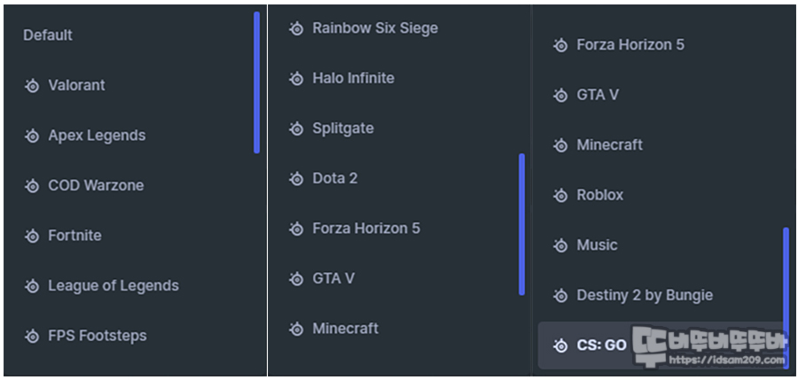 프리셋으로 선택할 수 있는 게임 리스트 모습.