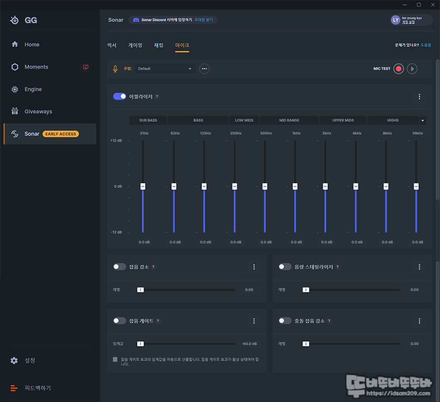 Sonar 메뉴는 볼륨 믹서 / 게이밍 / 채팅 / 마이크 설정 메뉴로 세분화되어있는데요.