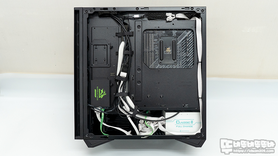 메인보드를 먼저 조립하고 8핀 보조 전원 케이블을 샤시 뒤에서 안쪽으로 넘겨 작업할 수 있는 편안한 케이스는 손에 꼽는데 그만큼 공간이 넉넉해서 수냉 쿨러 사용 시 라디에이터 조립에도 큰 문제가 없어 보입니다.