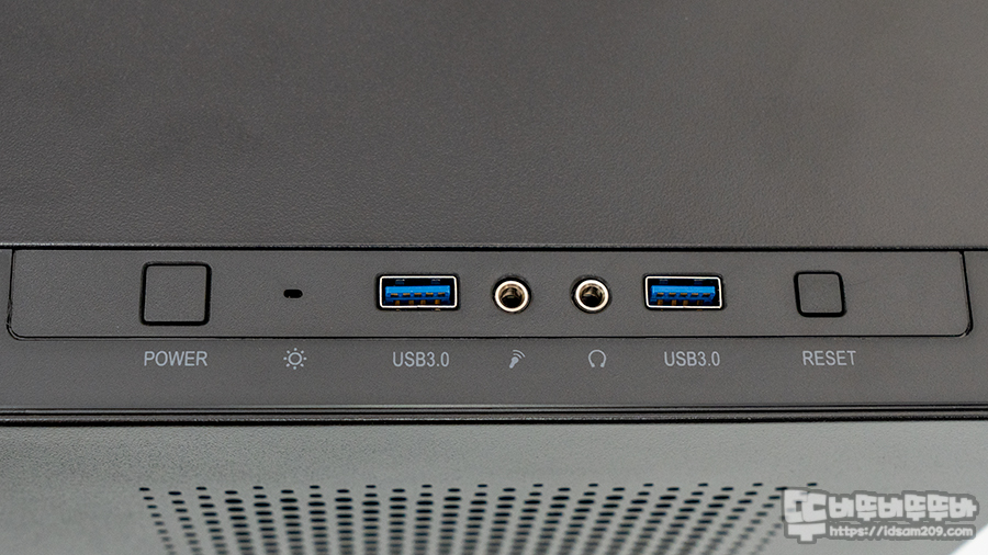 전면 I/O 포트는 전원 스위치 / LED 인디케이터 / USB 3.0 포트와 HD Audio 단자 그리고 리셋 스위치로 구성이 되어있는데 리셋 스위치는 RGB LED 효과 버튼으로 사용됩니다.