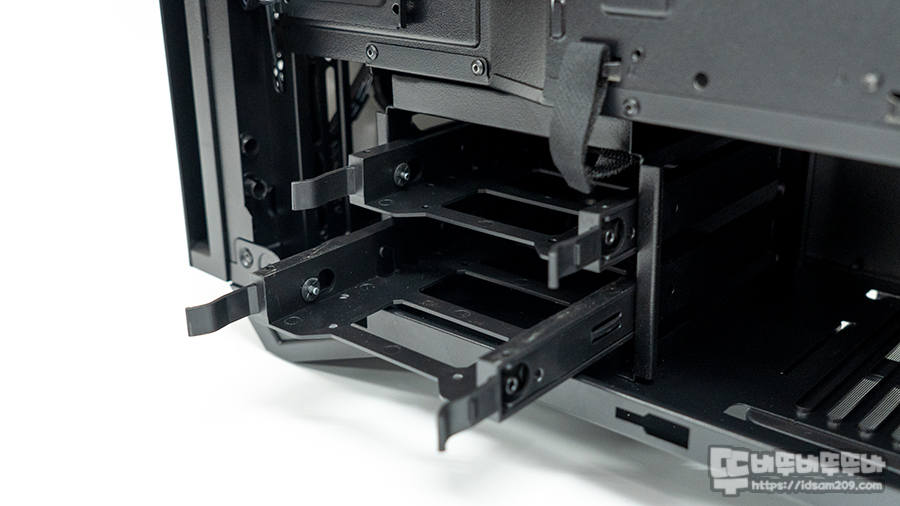 239mm의 파워서플라이 장착 공간 앞쪽에는 HDD/SSD 겸용으로 사용할 수 있는 하드 가이드를 제공하여 SSD 4개 또는 SSD 3개/HDD 1개, SSD 2개/HDD 2개로 저장 장치 구성이 가능합니다.