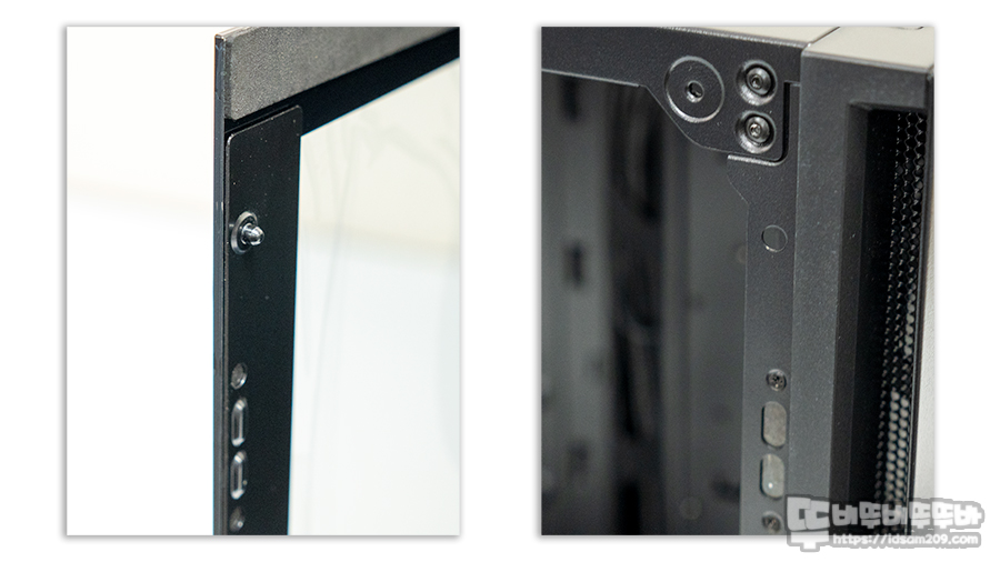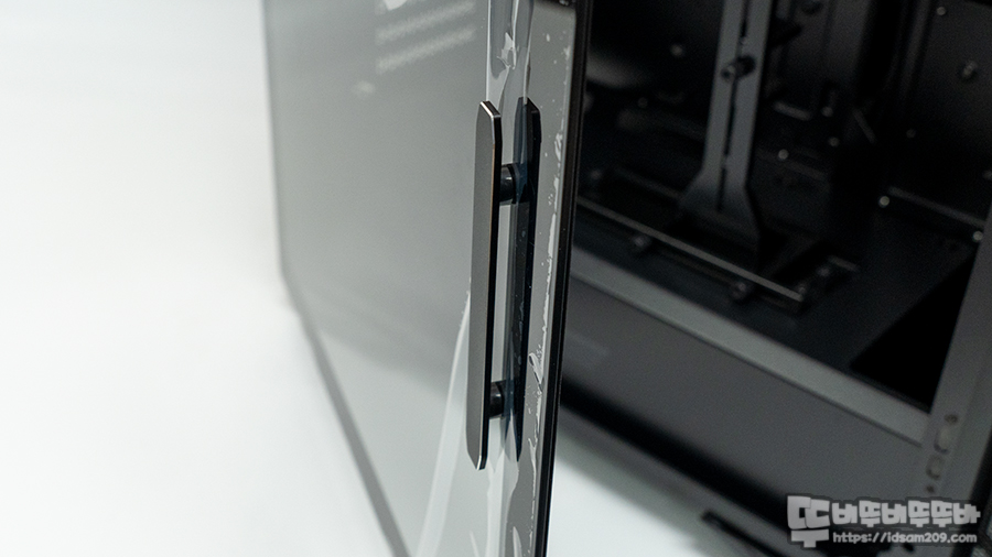 기존 제품에서는 강화유리 앞쪽 부분에 위/아래 부분에 동글한 자석을 사용으로 패널이 쉽게 오픈되는 문제가 있었지만 이번 제품에서는 강화유리 패널 앞쪽 세로 부분은 자석이 내장된 금속 프레임으로 디자인하여 샤시의 자석 체력을 높였습니다.
